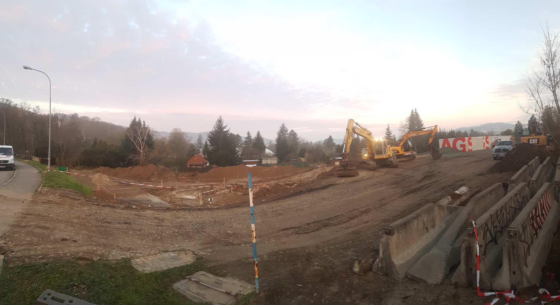 Začíná se navážet zemina a přivezli další techniku. Foceno z Žabovřeské dnes ráno.